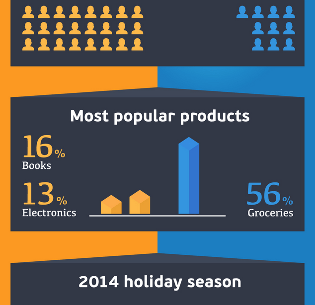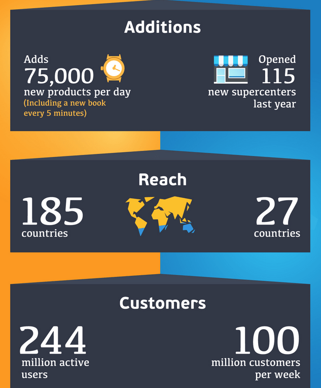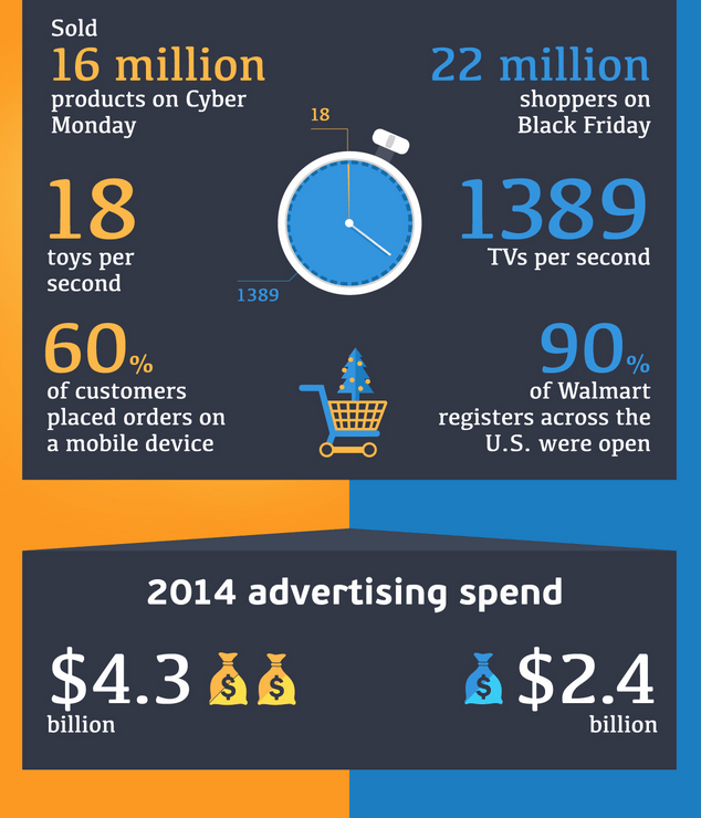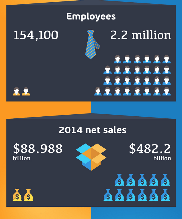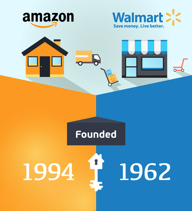La página WebpageFX Blog, realizó una infografía en la que compara a estos dos retailers gigantes y destaca datos interesantes de cada uno, por ejemplo: Amazon vendió 16 millones de productos en su “Cyber Monday” en 2014, sin embargo no es rival con los 22 millones de compradores que Walmart tuvo el “Black Friday”. WebpageFX Blog nos presenta su infografía: